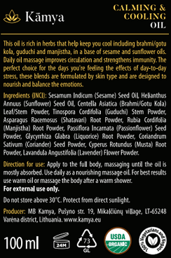 Sesamum Indicum (Sesame) Oil, Helianthus Annuus (Sunflower) Seed Oil, Centella Asiatica (Brahmi/Gotu Kola) Leaf/Stem Powder, Tinospora Cordifolia (Guduchi) Stem Powder, Asparagus Racemosus (Shatavari) Root Powder, Rubia Cordifolia (Manjistha) Root Powder, Passiflora Incarnata (Passion flower) Seed Powder, Glycyrrhiza Glabra (Liquorice) Root Powder, Coriandrum Sativum (Coriander) Seed Powder, Cyperus Rotundus (Musta) Root Powder, Lavandula Angustifolia (Lavender) Flower/ Flower Powder.