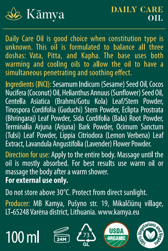 Body massage with oil is one of the most powerful techniques used in Ayurveda. Daily Care Oil is formulated to balance all three doshas: Vata, Pitta, and Kapha. This is a good choice if you do not know your constitution or if you have a complex constitution or imbalance. The base uses both warming and cooling oils to allow the oil to have a simultaneous penetrating and soothing effect.