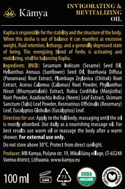 Kapha is responsible for the stability and the structure of the body. When this dosha is out of balance it can manifest as excessive weight, fluid retention, lethargy, and a generally depressed state of being. This energizing blend of herbs is activating and mobilizing, vital for balancing Kapha. Kapha is the combination of water and earth elements. This bio-energy is particularly associated with concentration, stability and energy storage, it gives people substance and strength. Vigorous massage with this herbalized oil, balance Kapha by promoting mild sweating, stimulating circulation and cleansing the system. Formulated in a base of organic sesame and sunflower oils, this invigorating Ayurvedic oil blend contains nine organic herbs including punarnava, chitrak, calamus, and rosemary.