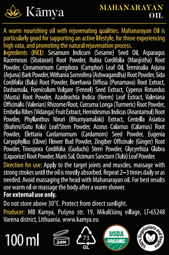 Mahanarayan Oil is an ancient Ayurvedic formula composed of potent medicinal herbs in a sesame oil base that are proven to heal numerous ailments often related to imbalances in the Ayurvedic element of air (Vata dosha) such as joint pain caused by arthritis. For joint and muscle support simply apply warm Mahanarayan oil to affected areas morning and evening. Self-massage of the whole body with Mahanarayan oil for at least 15 minutes once a week is restorative and strengthening and beneficial for anyone feeling debilitated by overwork or wishing to prevent the effects of stress and overwork. This oil is also very beneficial for pacifying excess Vata through its restorative action on the mind and body. Contraindications: avoid use when pregnant or breastfeeding. Mahanarayan oil is not recommended to increase the Ayurvedic element of water (Kapha dosha) and should not be used by those who are obese or suffering diarrhoea.
