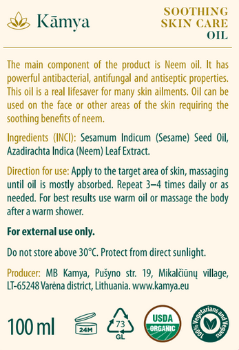 The main component of the product is Neem oil. It has powerful antibacterial, antifungal and antiseptic properties. This oil is a real lifesaver for many skin ailments. It will protect your skin from aging, moisturize, heal wounds and injuries, eliminate rashes and relieve irritation, reduce redness, and prevent scarring. The oil is also useful for scalp care if applied immediately before washing. It treats dandruff and other fungal diseases, relieves headach. Neem oil is suitable for long term prolonged use without any harmful side effects. Neem oil is produced from the seeds of the Neem tree and is referred to as a panacea for all diseases.